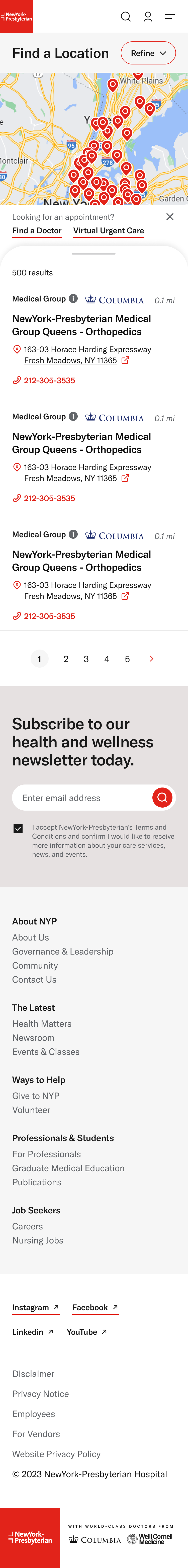 The “Find a Location” is a search tool that helps patients and visitors easily discover and navigate to hospitals, medical groups, and outpatient care facilities across the NYP network.